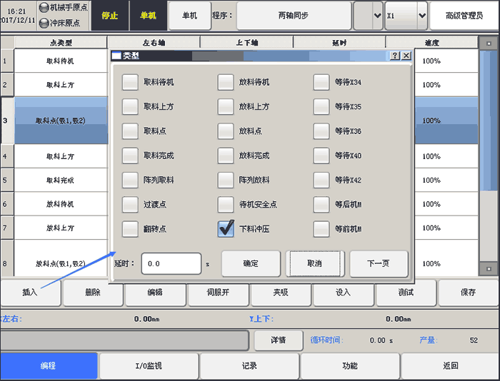 特别说明:绑定在取料点和放料点的阀时间的设定要在停止状态下点击【功能】→【用户】→【时间设定】中的“夹吸延时”编辑框中进行设置。