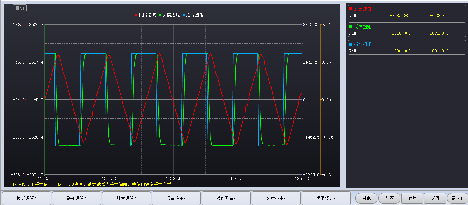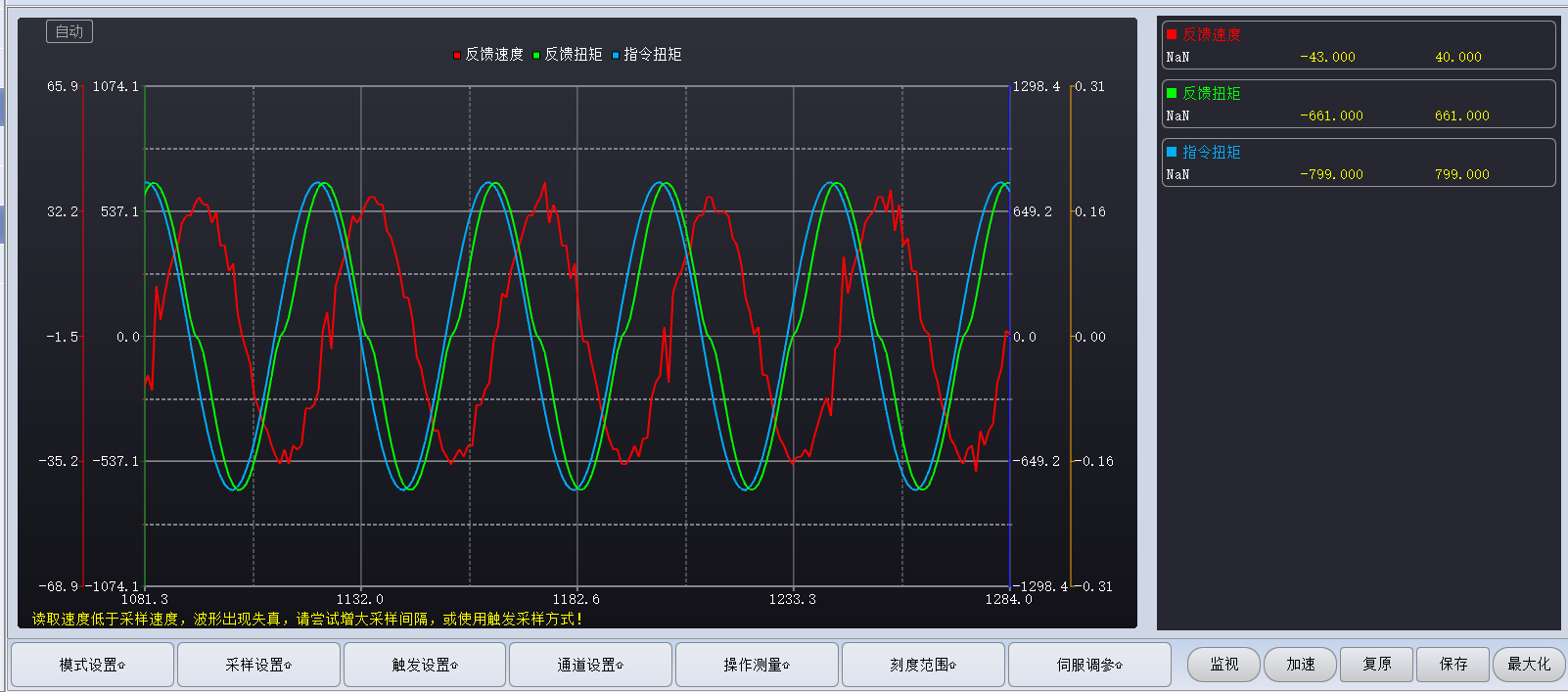 正弦响应:去使能后,将Pn10伺服模式设置为3,Pn61=100为转矩指令频率,使能。调节Pn65,Pn66,同时将Pn82写入1,观察波形,要求反馈不能超调,要求反馈不能滞后指令太多。指令幅值±800,反馈幅值不能小于±600。