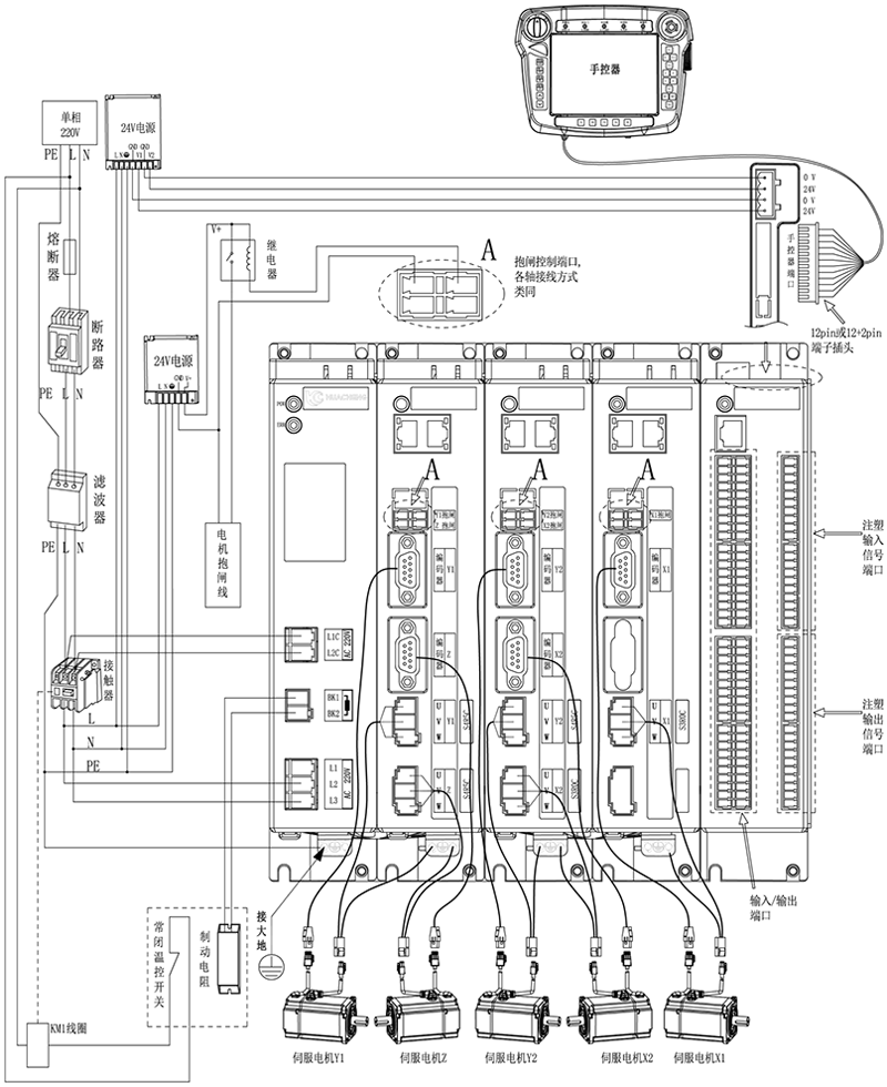五轴注塑驱控一体化机械手控制系统-EC-S5,箱体整体外观接线说明: