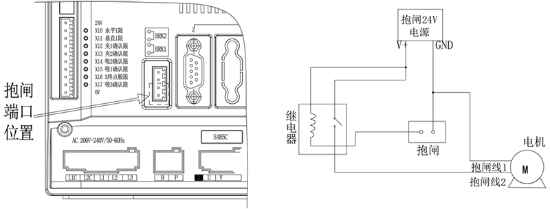 注:抱闸端口必须顺利获得外接继电器去控制抱闸器工作。
