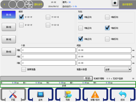 点击将要使用的堆叠程序组(如第1组),在顺序栏选择产品要堆叠的顺序, 设定好每个轴的堆叠产品个数和产品堆叠间距。