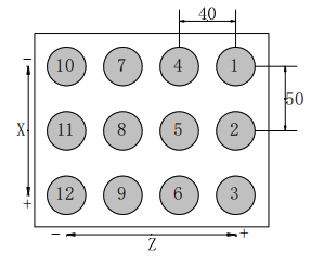 X 轴:间距 50/3个产品;Z轴:间距40/4个产品;Y 轴:间距30/2层。依照此设定,机械手沿X+轴方向间隔50mm 排列(①②③)三个产品在右边第一列,再沿Z-轴方向移动40mm排列(④⑤⑥)三个产品在右边第二列,以此类 推在排列完第12个产品后机械手沿Y-轴方向上升30mm,然后第一点位置开始重复排列第二层产品。由于是排列两层产品,故共能排放24个产品于货箱中。